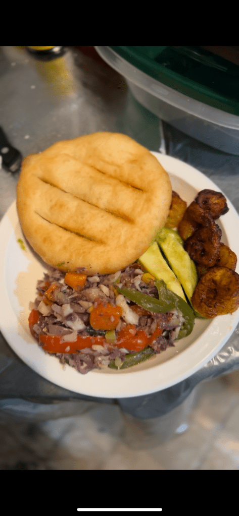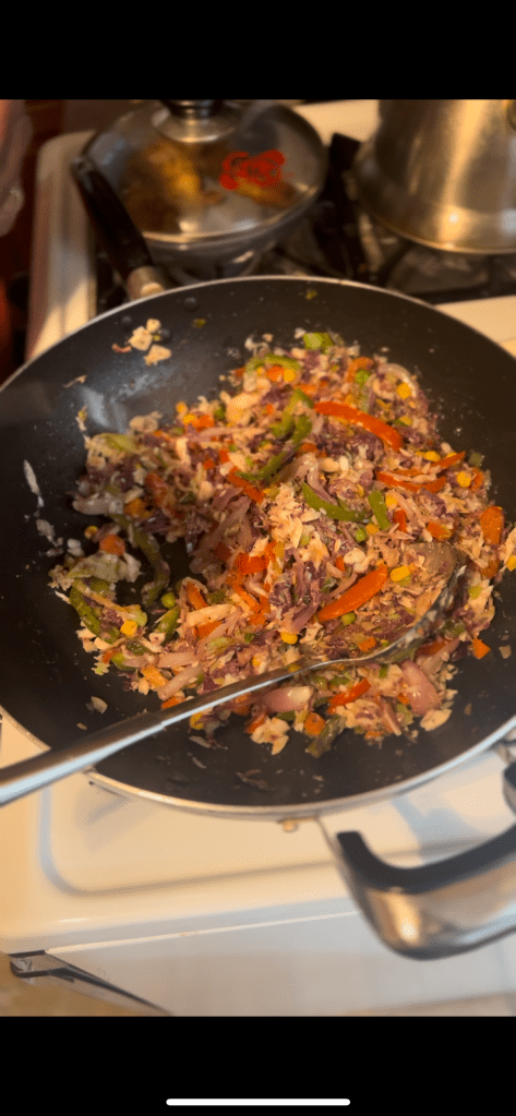 This is not a Dish I’ve made before. I don’t think I have that superpower. The best way I could describe the Dish is “Vegetable Salt-fish and Bake” but I don’t think that name really serves justice. “Vibrant Salt-fish and Bake” fits a bit better. I mean look at it . The flashiness of the bell peppers, and assorted cabbage is elegantly contrasted by the humble colors of salt-fish and onion (ironically two of the more prominent flavors in this dish). I love eating with my own eyes, so even the appearance of Vibrant Salt-fish and Bake was pleasing.